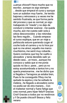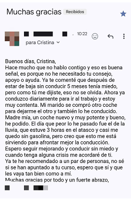 Maria Del Mar Arriola2022-08-05Trustindex verifica que la fuente original de la reseña sea Google. Cristina es una persona muy humana y cercana te ayuda mucho la recomiendo sin duda Bibi Saez2022-03-11Trustindex verifica que la fuente original de la reseña sea Google. Gracias a Cristina estoy superando mi miedo al coche e inseguridades a la hora de conducir. El método q usa y la energía q transmite, me ayudan a fortalecer mi autoestima y valor a la hora de coger el coche y ponerme en la carretera. 1000% recomendable!! Inés González2022-01-25Trustindex verifica que la fuente original de la reseña sea Google. Nunca dejaré de agradecer q Cristina se cruzara en mi vida. A parte de muy profesional, tiene una empatía q hace q tus miedos Se minimicen xq hace q sean compartidos. El trabajo q hace no es sólo q no tengas miedo a la conducción, sino a encontrar tu historia para averiguar de donde viene ese miedo y poder atacar ese foco, conocerlo, y q te acompañe pero no con miedo sino con herramientas para saber cómo actuar. Este tipo de miedo además es algo q es difícil de comunicar, no es entendible y no está como socialmente admitido. Yo tengo carnet hace muchos años y siempre ha habido algo q ha impedido q fluyera esa conducción normal, pero no podías hablar con nadie xq es como ...perdona??? ....pero si tienes el carnet?? ....y??? Al final encierras tu vergüenza con tu miedo. Gracias a Cristina, a hacernos ver q esto es más común de lo q parece, técnicas, y su aprendizaje he avanzado muchísimo y cada paso q doy , abre otro nuevo y así superar esas situaciones y ese miedo q acompaña una historia q con Cristina aprendemos a conocer y a afrontar. Así q gracias, gracias y gracias x ser como eres y gracias x la ayuda q siempre nos has ofrecido en los cursos y fuera de ellos. Myriam Julia Campos2022-01-24Trustindex verifica que la fuente original de la reseña sea Google. Recomiendo en primera persona acercarse a Cristina y dejarse ayudar por ella. Cuando la conocí buscando en la web este problema que acababa de presentarse en mi vida fue como una luz en todas mis tinieblas. Es una gran profesional que además transmite con nobleza y dulzura como enfrentarse a los miedos y a los bloqueos. La recomiendo 100%. Mi caso está vinculado a la ansiedad y al estrés....siempre fui una conductora sin problemas hasta que un día sucedió y me vi afectada por este miedo a conducir. Cristina me ha ayudado a entenderlo y a trabajar para superarlo. Paloma Chaparro Briones2022-01-14Trustindex verifica que la fuente original de la reseña sea Google. Me saqué el carnet de conducir con 18 años y jamás volví a coger el coche. Tras 20 años,lo intenté en 2 autoescuelas y sólo Cristina ha logrado que coja mi coche, sola o acompañada. Parece mentira que estando tan lejos físicamente, haya estado y esté tan cerca para acompañarme en el proceso y la aventura de perder el miedo a conducir. Gracias Cristina x tanto. vanesa reino2022-01-10Trustindex verifica que la fuente original de la reseña sea Google. Me saque el carnet y a los pocos meses deje de conducir pues me producía ansiedad ,una gran rigidez y bloqueo. Vivo en un pueblo y no conducir me limitaba mucho. Cuando hice el curso con Cristina llevaba 4 años sin conducir. .Cristina es una increíble profesional llena de paciencia y empatía ,me enseñó a detectar de dónde venía ese miedo , a ganar confianza en mí misma y poder relajarme . Llevo meses conduciendo y ahora cojo el coche cada día .He conseguido lo que nunca pensé que alcanzaría :disfrutar de la conducción . Sin duda para mí ha sido de las mejores cosas que me han pasado.